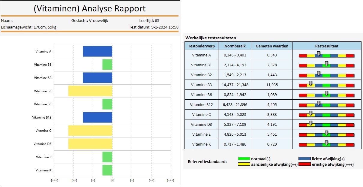 Een geavanceerde softwaretoepassing analyseert het resultaat. Voor elke parameter worden de normwaarden gegeven en de afwijking daarvan, grafisch en in cijfers. Binnen enkele minuten geeft deze test inzicht in de tekortkomingen van de absorptiecapaciteit van het lichaam.
