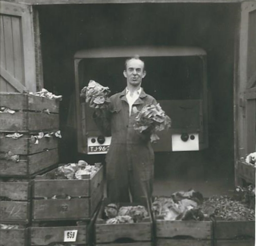 Groenteboer Arie van de Hoef voor het Oude Pakhuis
